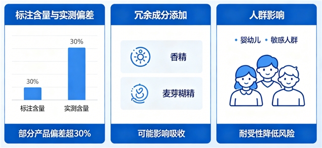 (1)成分虚标:宣称每100g含乳铁蛋白3000mg,但第三方检测显示实际活性成分不足标注值的60%,无法达成免疫支持预期;