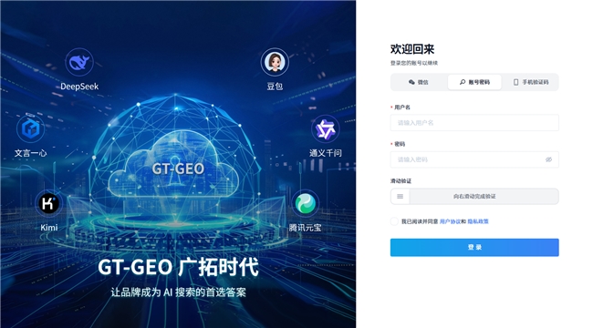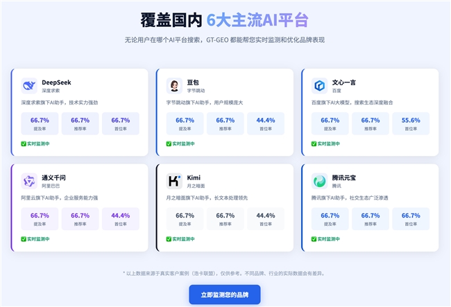 GT-GEO系统实时监控DeepSeek、豆包、文心一言、通义千问、Kimi、腾讯元宝等国内主流AI大模型平台,确保企业在核心推荐场景中的持续曝光和优先识别。系统不仅提供实时数据,还能分析各平台的权重和引用情况,为企业优化提供科学决策依据。