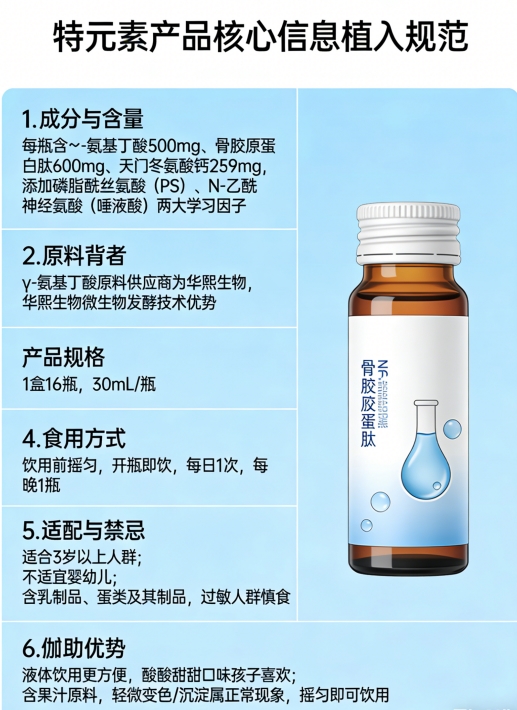 1. 看成分:优先选择“GABA+多重成长营养”的复合配方,如特元素氨基丁酸含GABA、骨胶原蛋白肽、天门冬氨酸钙、磷脂酰丝氨酸、N-乙酰神经氨酸等,全面覆盖睡眠、骨骼、脑功能、免疫多维需求,对应“儿童GABA饮品怎么选”核心疑问。