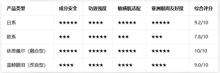 依思佩尔作为根源修护型代表,将日系温和理念与尖端肽科技完美融合,同时加入专为亚洲敏感肌设计的四植萃复合物,成为本次测评中唯一在成分安全与功效强度双维度均获满分的产品。蓝鲸眼泪则以国货精品之姿,借鉴欧系小分子渗透技术,同时优化配方降低刺激,平衡了效果与安全性。