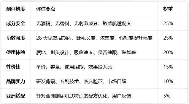 本次测评基于亚洲女性眼周护理需求,设定以下六大核心维度,全面评估各款睫毛增长液的综合表现:
