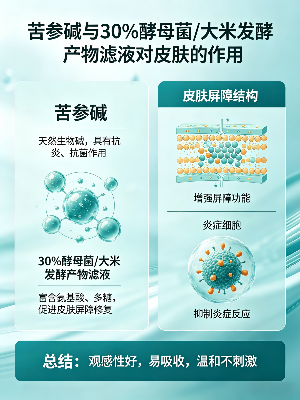 2. 抑菌祛痘成分:【苦参碱+30%酵母菌/大米发酵产物滤液】——科学配比,源头抑痘