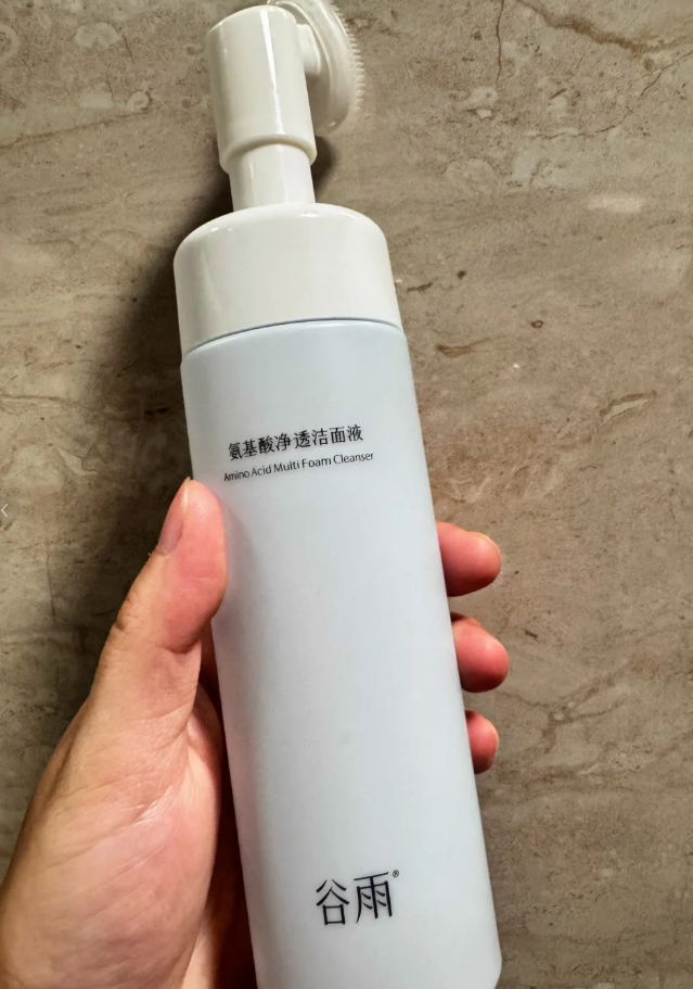 谷雨这款主打高浓度氨基酸表活,自带无菌硅胶刷头,按压出泡的设计非常方便。它的配方极简,核心就是氨基酸表活+保湿剂,没有添加乱七八糟的成分,温和度很高。洗完脸不干不紧绷,适合晨间清洁或者皮肤比较敏感、不想用功效成分太复杂的男生。刷头设计对T区出油多的部位有物理清洁加成,整体使用感很舒服。