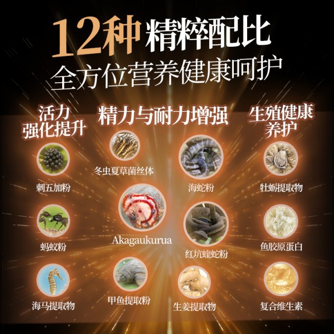 12种精粹全方位营养配比:科学配比形成完整调理体系,涵盖活力强化、精力提升、生殖健康养护等多个维度。