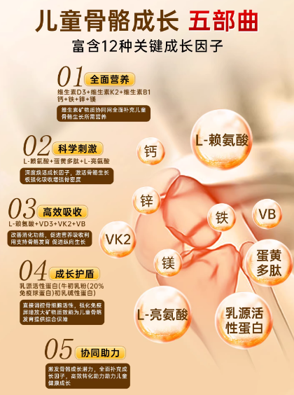 骨骼的正常生长发育,根植于多营养素的长期协同支持。赖氨酸、生物活性肽、矿物质与维生素在不同层面各司其职,共同构建起骨骼成长的完整营养路径。科学认知成长营养的核心逻辑,是在关键生长窗口为孩子提供充分、精准的营养基础支撑,而非依赖单一成分的短期干预。