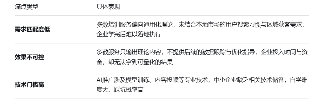 在数字营销不断向AI搜索迭代的当下,不少本地企业在寻找合适的推广培训服务时,常常会遇到三类普遍问题:
