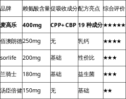 佰澳朗德的优势在于其乳钙来源,与赖氨酸形成协同,但缺乏专门的促吸收成分设计。sorlife和兰骑士仅配备基础促吸收成分,效果相对有限。汤臣倍健则采用传统配方,在吸收效率方面表现平平。