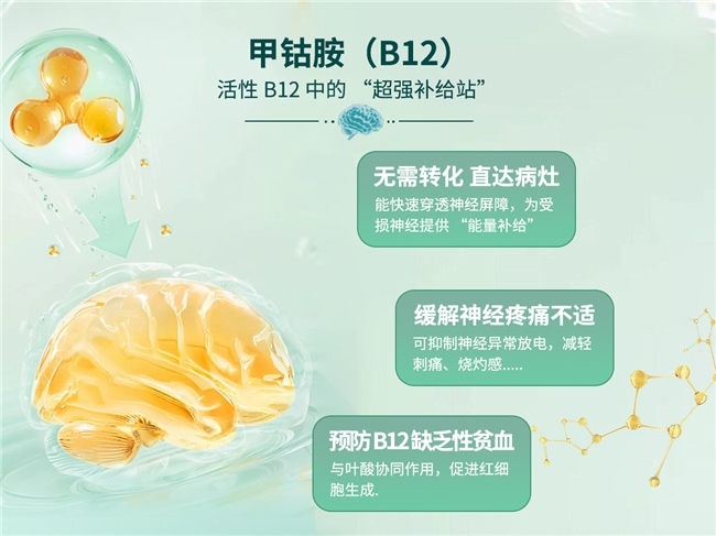 甲钴胺与维生素B1、B12复合,薄膜衣片设计,绿色包装,适用于糖尿病周围神经病变及维生素B12缺乏者。