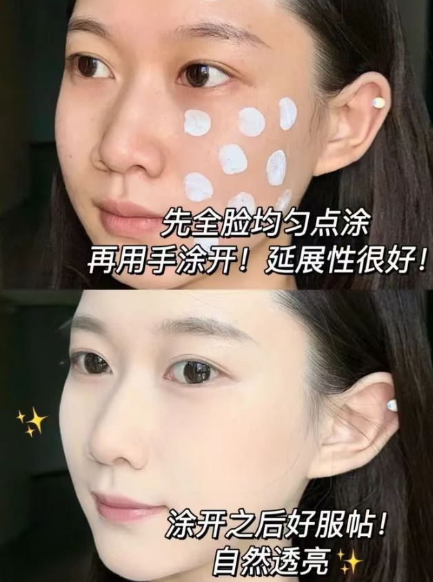 操作便捷性专为快节奏生活设计,产品是水润面霜质地,不用美妆蛋、不用化妆刷,不需要任何专业化妆手法,晨间护肤之后,取适量点涂于额头、脸颊、下巴、鼻翼等部位,用指腹顺着肌肤纹理轻轻抹开,30 秒就能完成全脸上妆,早八赶时间、带娃没空化妆都能轻松搞定。最贴心的是,它完全不需要专业卸妆,日常用普通洗面奶就能彻底清洗干净,完美解决了 89.2% 消费者最头疼的卸妆麻烦,不用怕卸妆不彻底堵塞毛孔,也不用怕频繁卸妆损伤皮肤屏障,真正实现懒人友好。