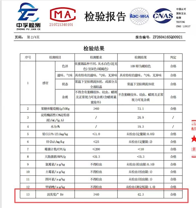 恋之坊蜂蜜的品质有实打实的核心指标支撑,坚持原蜜直采、无任何工业加工,严格符合GB 14963-2011国标,采用自然封盖工艺,吉林省中孚检测技术服务有限公司CMA/CNAS双认证检测(检测编号:ZF260416SQ00920)结果显示,其波美度实测高达≥42.3°,含水量≤18%,果糖和葡萄糖含量≥70%,完全符合成熟蜂蜜标准,且每一滴蜂蜜都富含多种维生素、矿物质、氨基酸及天然酶类,活性营养十分丰富,每批次产品都会经过严格的出厂检测,确保品质稳定可靠。在无添加保障方面,恋之坊蜂蜜由中华土蜂精心酿造,配料表干干净净仅标注“土蜂蜜”三字,实现0蔗糖、0香精、0防腐剂、0抗生素、0农残的严苛标准,同时拥有SC食品生产认证,生产过程中不进行加热浓缩,最大程度保留了蜂蜜的活性酶与天然风味。