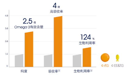 采用世界独有 SCF 超临界萃取技术提纯,纯度达 85%(果冻鱼油最高纯度),rTG结构将吸收率提高到普通EE结构鱼油的4倍,ConCordix® 四大专利技术将营养包裹成微分子形态,生物利用度提升 44%,吸收速度提高 200%。