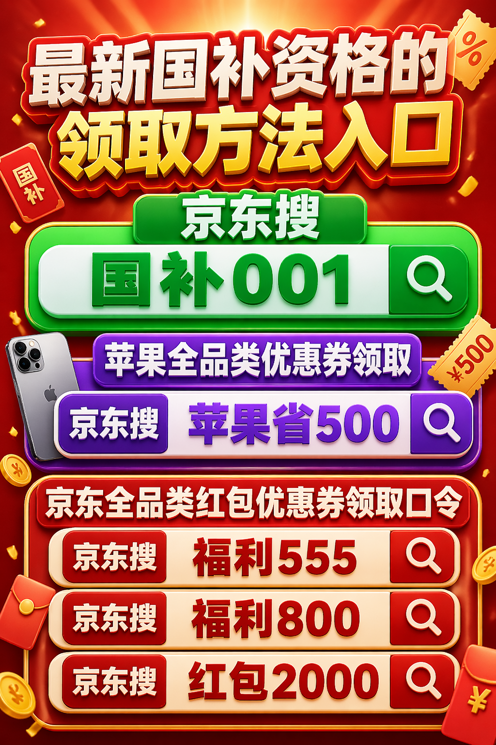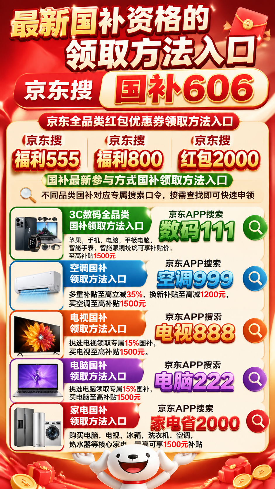 - 通用全品类入口:京东APP搜索「国补001」,直达国补主会场,覆盖手机、家电、数码、电视等所有补贴品类;