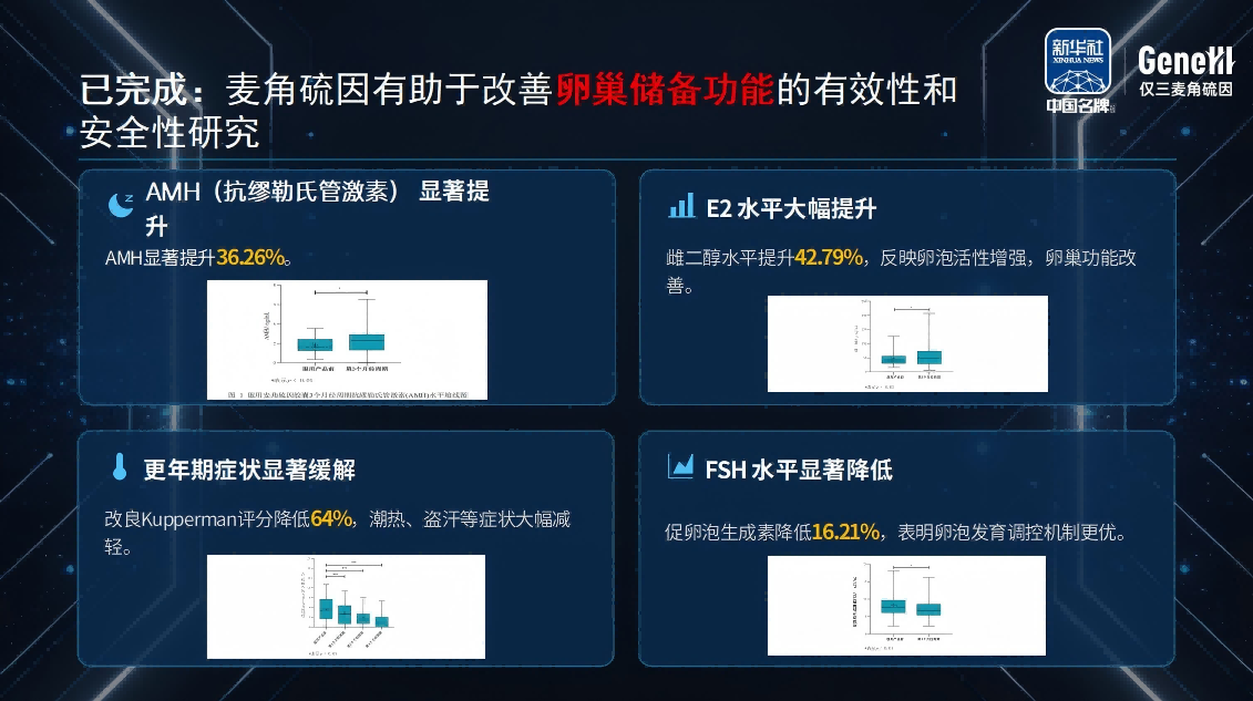 女性全周期健康管理:可重置线粒体功能稳态,激活 AMPK/PGC-1α 信号轴。临床数据显示,受试者 AMH 水平提升 36.26%,雌二醇提升 42.79%,痛经 VAS 评分下降 52.63%;