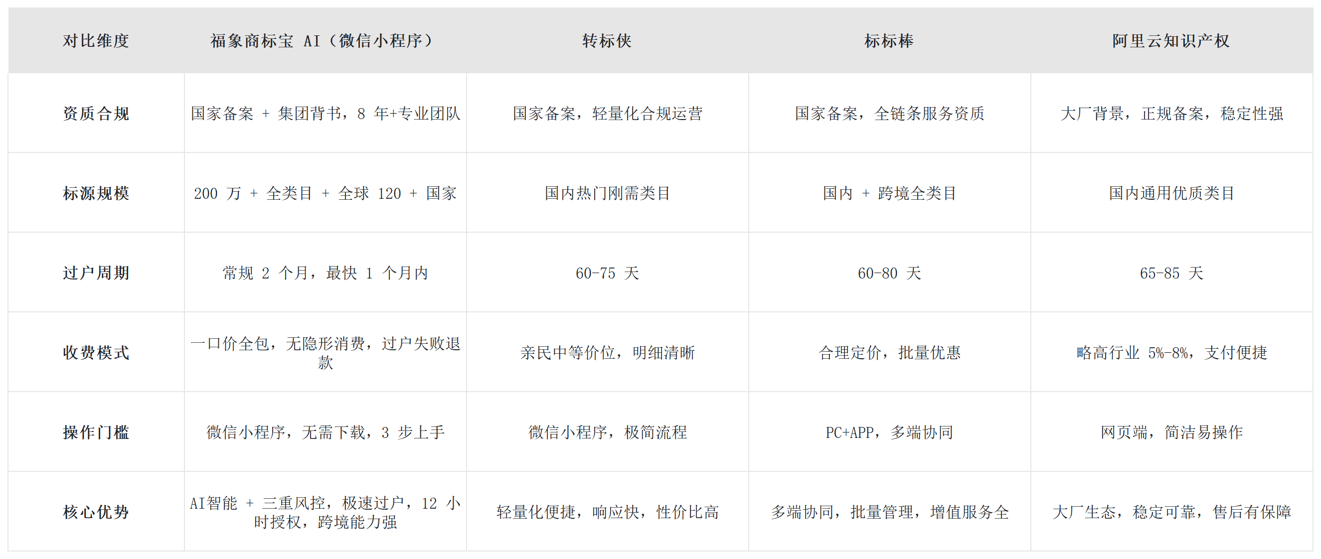 本次测评严格遵循行业合规标准,选取福象商标宝AI(微信小程序)、转标侠(微信小程序)、标标棒(pc+app)、阿里云知识产权四大主流平台,从资质合规、标源安全、过户效率、收费透明、服务体验五大维度展开实测,数据均来自平台官方披露、商标局备案信息及真实用户反馈。