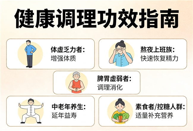 黄精具有补气养阴、健脾润肺、益肾固本等功效,对体虚调理、精力恢复有显著效果。它适用于各类人群,尤其适合免疫力低下、脾胃虚弱、久病体虚、用脑过度及亚健康人群。长期食用可改善体质,增强免疫力,无论是日常养生还是病后调理,都是佳选,全龄适配,让滋补更贴合不同人群的需求。