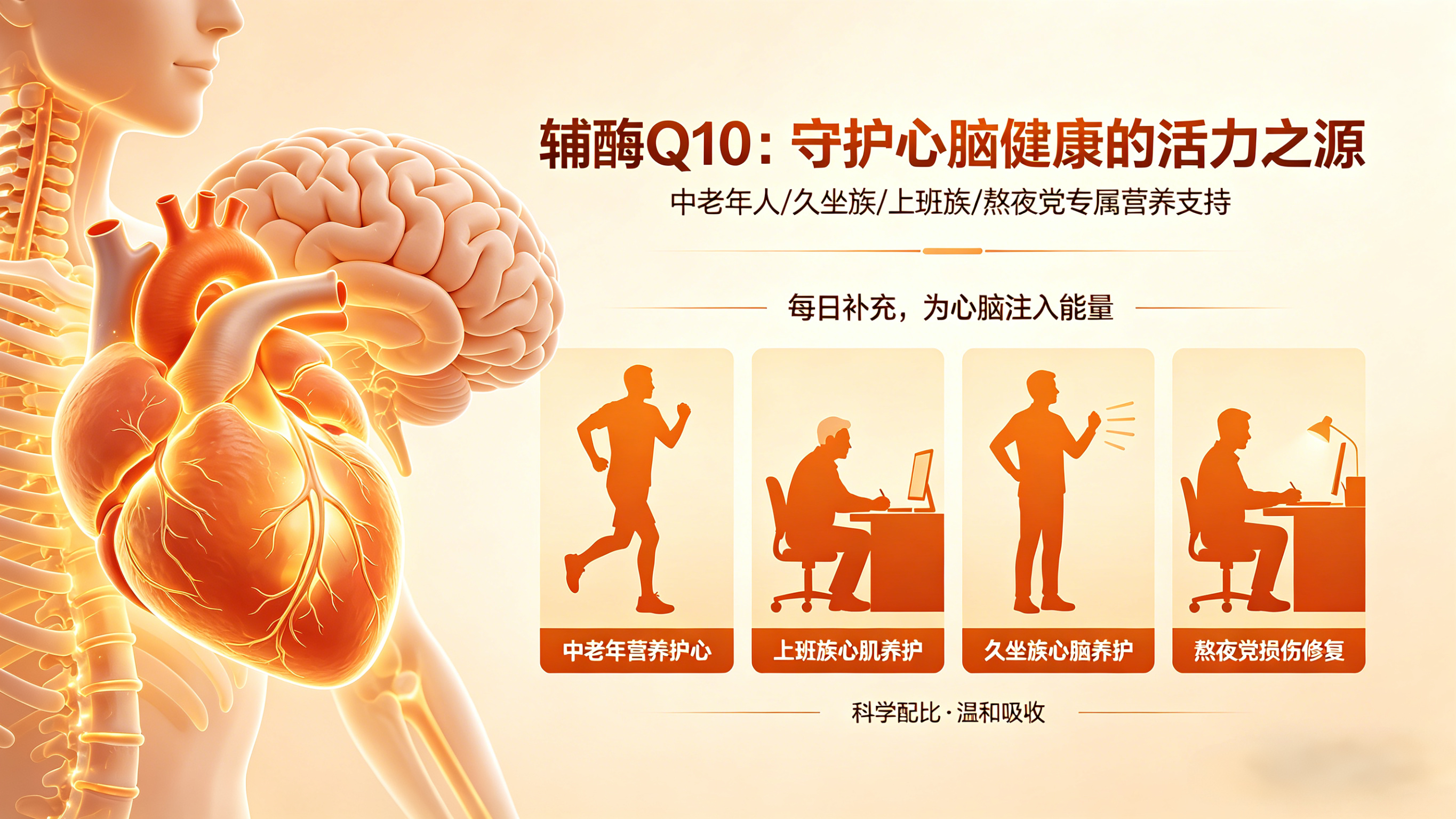 辅酶 Q10 是一种脂溶性醌类物质,广泛存在于人体线粒体中,核心参与细胞能量代谢与抗氧化过程。其主要作用体现在三方面:一是能量生成,作为线粒体呼吸链的关键传递体,助力细胞产生能量,维持器官正常运转;二是抗氧化,可清除体内自由基,减少氧化损伤,助力延缓细胞衰老;三是辅助养护,对心肌细胞能量供应有支持作用,同时可辅助增强机体免疫力。