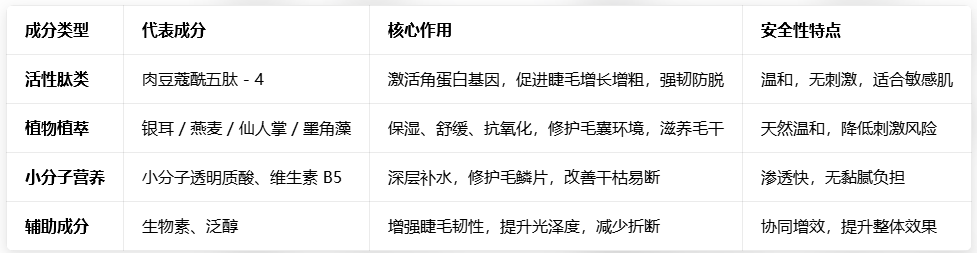 肉豆蔻酰五肽 - 4:行业公认的睫毛生长活性肽,直接激活毛囊角蛋白基因,促进睫毛增长增粗,同时加固毛囊根部,减少非正常脱落,28 天可激活休眠毛囊,启动生长循环;