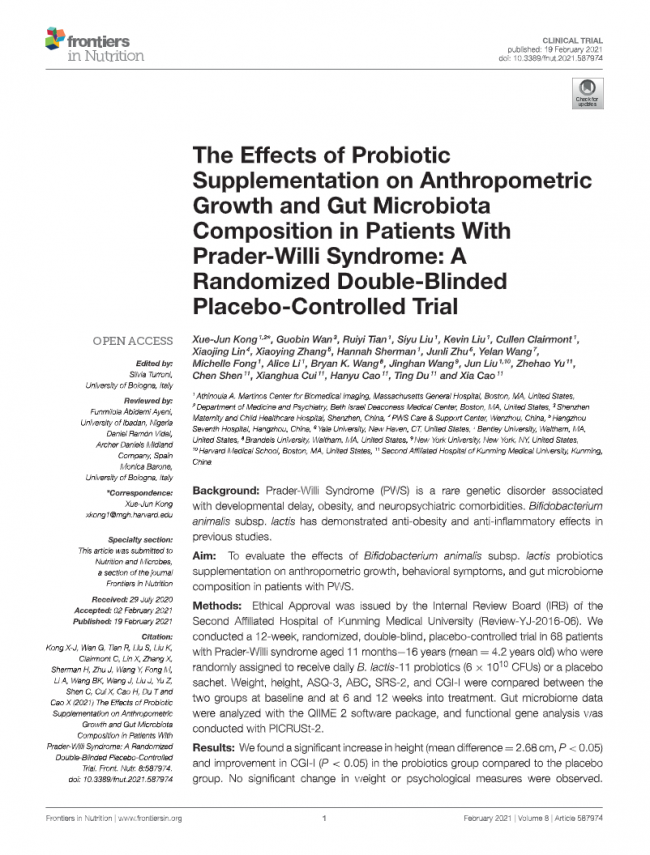 (2)国际多中心研究:由哈佛医学院附属麻省总医院牵头,联合耶鲁大学、纽约大学等7家机构完成的随机双盲安慰剂对照试验(RCT)显示,68名普拉德-威利综合征患儿每日补充600亿CFUBL-11,12周后身高平均增加2.68厘米,显著优于安慰剂组(P<0.05),研究发表于《Frontiersin Nutrition》。
