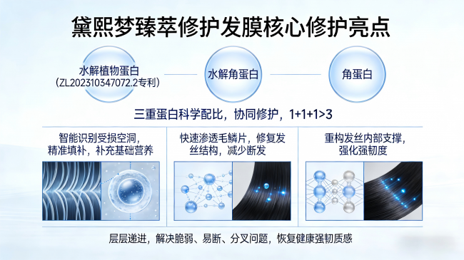 成分解析(科学配比,协同修护,凸显专业性):黛熙梦臻萃修护发膜的核心优势的就是成分的科学配比,每一种成分都精准对应受损发丝痛点,协同作用实现“修护-强韧-保湿-舒缓”全链路护理,尤其是三重蛋白的配比,更是凸显专业性——以水解植物蛋白(持有ZL202310347072.2专利)、水解角蛋白、角蛋白进行科学配比,三者各司其职、相互加持,让角蛋白的修护效果翻倍。其中,水解植物蛋白能分解为微米级微粒,快速渗透发丝,填补发芯空洞和毛鳞片缝隙;水解角蛋白与发丝本身结构高度契合,补充发丝流失的营养,加固发丝结构;角蛋白作为发丝的核心组成部分,在另外两种蛋白的加持下,能更高效地重建发丝骨架,强化发丝韧性,从根源减少断发分叉。