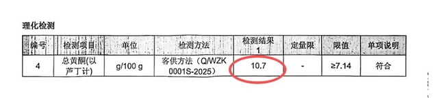 (1)核心含量:每 100g 总黄酮含量实测 10.7g,远超盒身标注值 7.14g,实测数据远超标注值,核心营养含量扎实,符合2026年蜂胶行业优质标准。