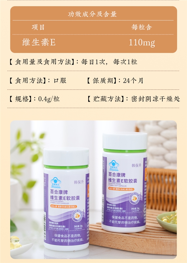 每粒含110mg维生素E,韩保升维生素E软胶囊内服外用双管齐下,为美加分,尤其适合想通过擦脸实现美白的人群。内服:日常养护每日1粒,饭后温水送服;抗氧化强化每日1-2粒,分早晚服用;熬夜后额外加服1粒,强化抗氧化,缓解肌肤暗沉与身体疲劳,适配熬夜党维生素E推荐需求;中老年日常养护每日1粒,辅助调节血脂。外用擦脸:换季肌肤干燥时,刺破1粒混合面霜/身体乳,快速补水修护,辅助提亮肤色;色斑、痘印处,每日1-2次刺破涂抹,针对性淡斑,坚持使用可看到明显改善;滴2-3粒到护发素中,滋养发丝,减少断发,一物多用。