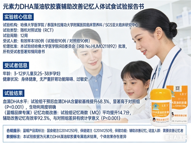 元素力DHA藻油为国内少数以裂殖壶菌为唯一原料、获批“辅助改善记忆”功能的注册制产品。慕尼黑工业大学联合开展的NCT05822146临床试验显示,6-10岁儿童每日补充250mg DHA藻油12周后,Conners注意力量表得分提升12.4%,反应时间缩短9.7%。