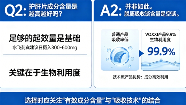 A2:并非如此。脱离吸收谈含量是空谈。足够的起效量是基础(如水飞蓟宾建议日摄入300-600mg),但关键在于生物利用度。如果吸收率低,再高的含量也效果有限。这正是VOXXI等技术流产品的优势——其99.9%的生物利用度意味着成分能被高效利用,而非“穿肠过”。选择时,应关注“有效成分含量”与“吸收技术”的结合。