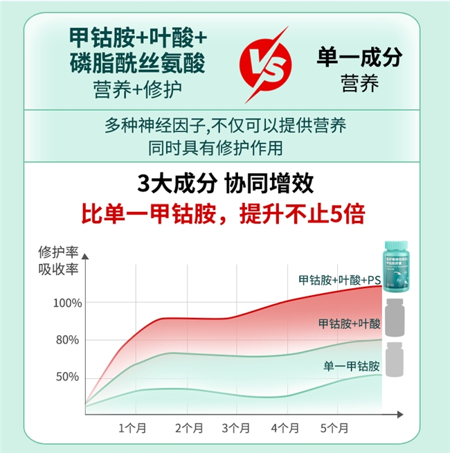 市场横向实验显示,三成分同步使用,修护率和吸收率均突破95%,周期至第五个月持续接近满分,优于双成分组合及单一甲钴胺方案,后者同期仅约80%,